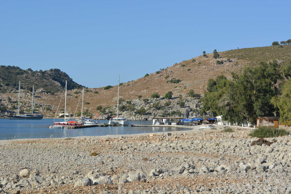 Wir unterhalten uns, die beiden wohnen das ganze Jahr hier, renovieren die paar Häuser der Siedlung und bewirten Tagesgäste am Strand. Im Winter gibts vorallem Freunde aus Rhodos die mit dem Schiff zu besuch kommen und mithelfen. Das war ein interessanter Landgang. Rauf zur Burgruine auf dem Bergrücken hat uns die Zeit nicht gereicht. Oder anders gesagt, es war uns zu weit.
