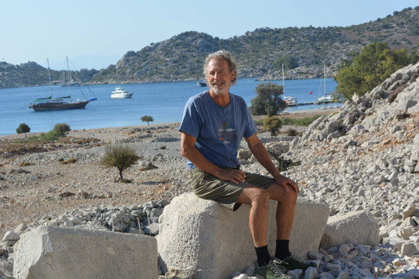 Wir verlassen Bozburun und nutzen den wenigen Wind zwischen Simi und der türkischen Küste und segeln südwärts ums Kap Karaburun. Bald sehen wir die schmale Einfahrt in die Bucht von Lorima. Oben auf der Landzung tronen die Überreste der antiken Stadt Bozzukale. Diese geschützte Bucht wurde von den Athenen als Hafen genutzt.